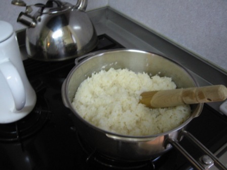 続いて、もち米。ご飯より水分を控えて炊きます。