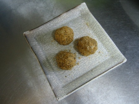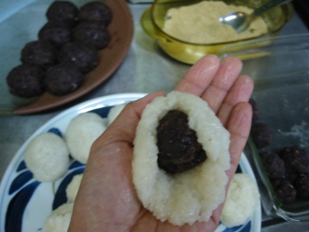 小さい方のあんこを置いてもち米で包んで砂糖を加えたきな粉をまぶせば、