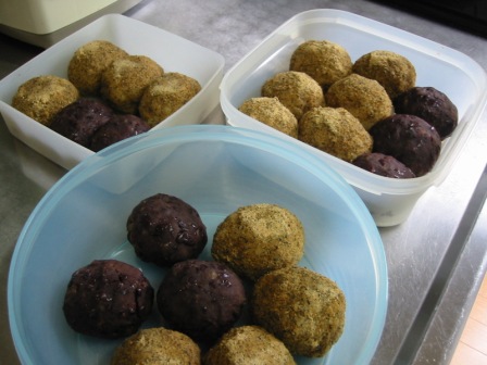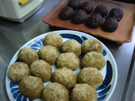 おはぎのできあがり。ぼたもちはその逆。。大きい方のあんこを