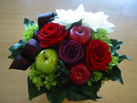 「りんごを使って秋らしい雰囲気で」、というワタシのお願いを、プリザーブのバラとアジサイ・アイビーの葉などに白いダリアをあしらって、イメージ通りに仕上げてくれた。