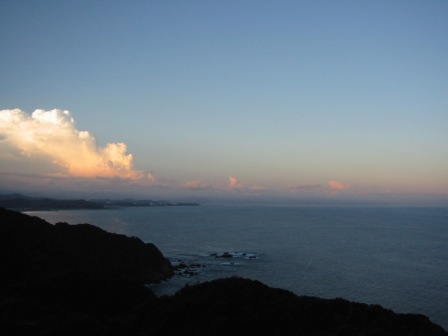 土佐市内の、海を見下ろす宿にチェックイン。日の入りを待って露天風呂へ。