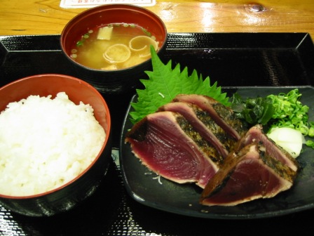 旅行一番の目的。。いや、息子の試合観戦のついで、まぐろのたたき定食。一切れがすんごく大きくて肉厚、しかも焼きたてのカツオの香ばしいかおり。。おいしーーーっ!!ここまで来た甲斐があった!お腹いっぱいにもかかわらず、その後、生カツオの刺身・土佐巻き(カツオのたたきの入った海苔巻き)・ウツボの煮こごりを買ってオットと宿で一杯。。