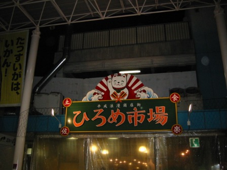 お風呂から上がって、ふたたび車を飛ばし、夕飯を食べに高知市内にある ひろめ市場へ。