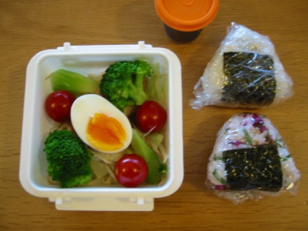 太もやし・茹でキャベツ・ブロッコリー・エリンギ・プチトマト・ゆで玉子・みょうがのサラダ