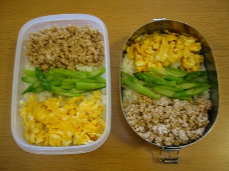 鶏そぼろと炒り玉子、ゆでアスパラの3色丼弁当