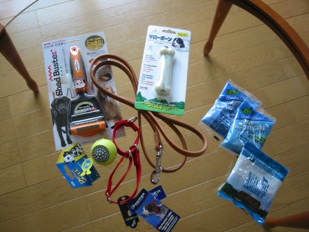 グルーミングのブラシやおもちゃを購入。ペットフードのサンプルを3袋ももらった。
